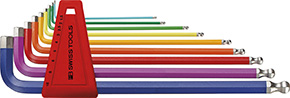 Chiavi esagonali piegate lunghe. Punta sferica BALLPOINT. Chrome-Vanadium. Colorate, ad ogni misura corrisponde un colore. Serie 6 pz: mm.1,5-2-2,5-3-4-5. Serie 7 pz: mm.1,5-2-2,5-3-4-5-6. Serie 9 pz: mm.1,5-2-2,5-3-4-5-6-8-10.