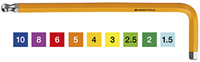 Chiavi esagonali piegate lunghe. Punta sferica BALLPOINT. Chrome-Vanadium. Colorate, ad ogni misura corrisponde un colore. Misure: mm.1,5-2-2,5-3-4-5-6-8-10.