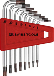 Chiavi maschio Torx piegate. Chrome-Vanadium. Serie 8 pz: T6-T7-T8-T9-T10-T15-T20-T25. Supporto in plastica.