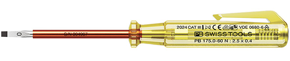 Per viti a taglio. Cacciavite cercafase 110-250V. Stelo isolato in speciale lega d'acciaio per molle, resistente e durevole. Clip da taschino. Conformi alla norma di sicurezza VDE 0680/6.